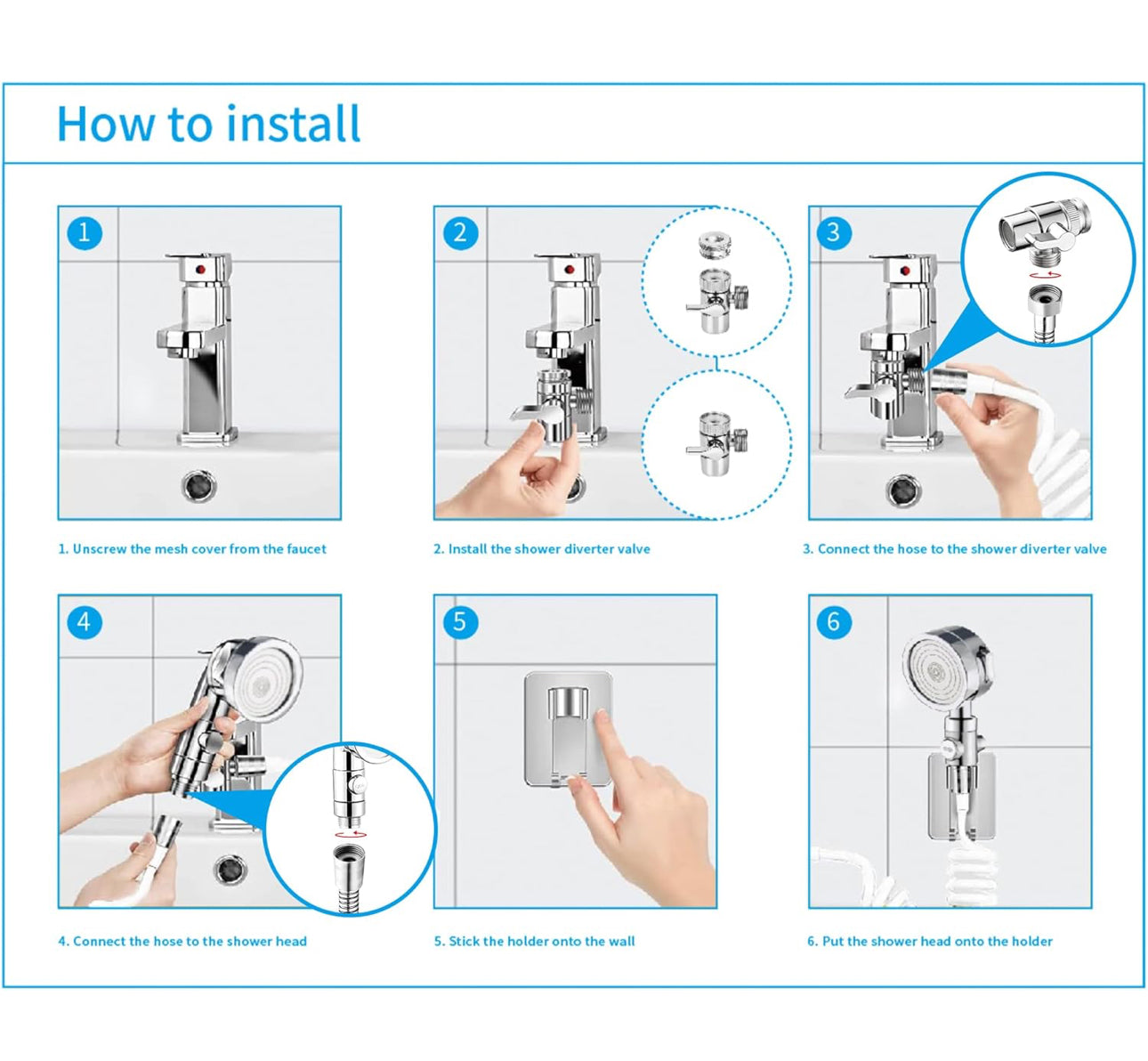 Doccino Lavandino, con 1.5 m di tubo doccia, manuale di istruzioni incluso, puoi facilmente eseguire l'installazione fai-da-te secondo le istruzioni. Funziona con la maggior parte dei rubinetti (si prega di controllare le dimensioni del rubinetto prima dell'acquisto).